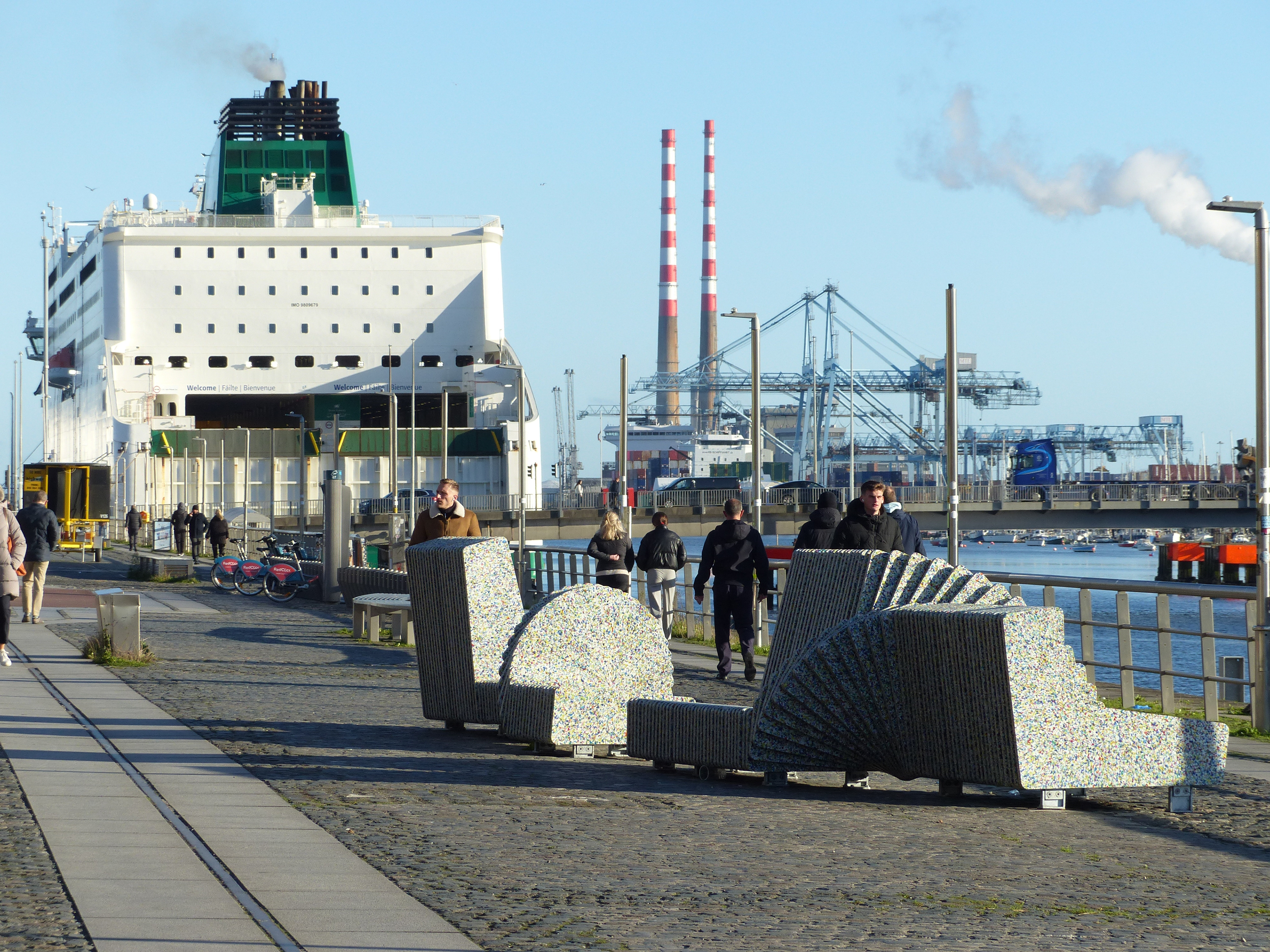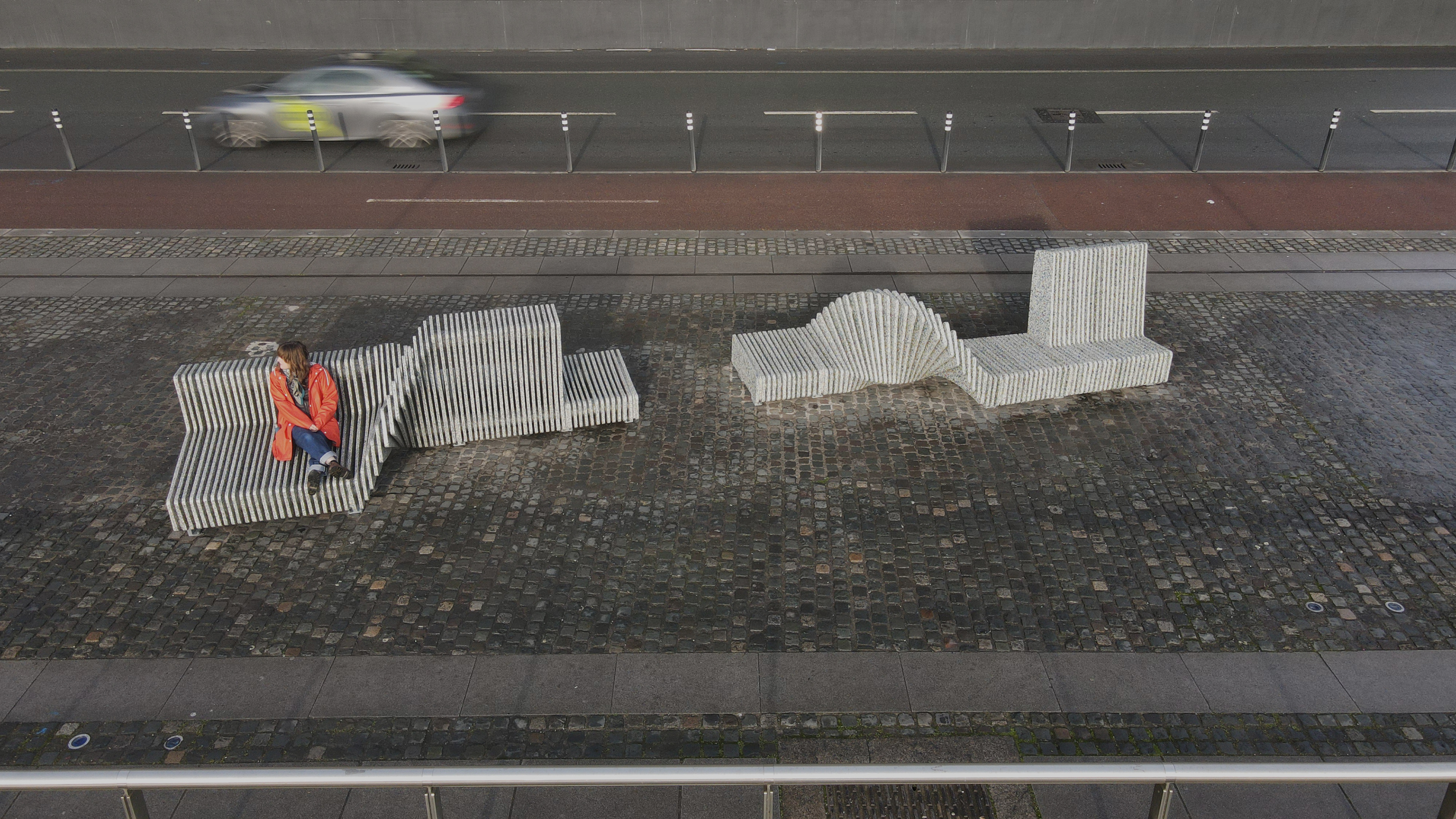Working with industrial designer Eoin Billings and his team in Billings Jackson Design, Byrne has worked from tiny cardboard models using modular elements to the design of the full-scale wavelike sculptures. Even the steel fabrication, which stiches the polymer elements together, is closely linked to the Liffey, with engineer and fabricator Roger Smith of Steel Smith being a fellow sailor of Byrne’s. Byrne’s artistic process is much more than action-based production and there is important meaning to her commission. Liffey Love is concerned with the pressing and deeper issues of the need to develop ‘circular economies’ rather than a consumer-based habits with which we are all too familiar of ‘use and dispose’. She has a particular interest in plastic as an omnipresent material in our daily lives. The underlying meaning of the artworks and commissioning process will only truly come to life with the interaction of people sitting on the social sculptures, which are intriguingly designed to accommodate people who wish to sit, perch or lounge on them for a chat or to contemplate. The sociability of the artworks will be added to by a program of meet-ups at the sculptures inviting local schools and community. You can link to her website available through QR Codes located on site to learn more about the project.